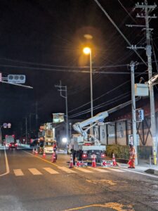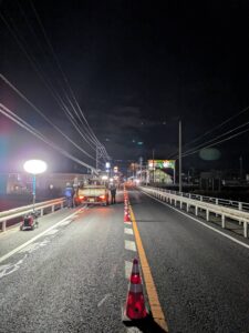 令和7年12月17日に伊勢崎市赤堀町の国道50号で滅灯を伴う夜間規制業務を行いました。