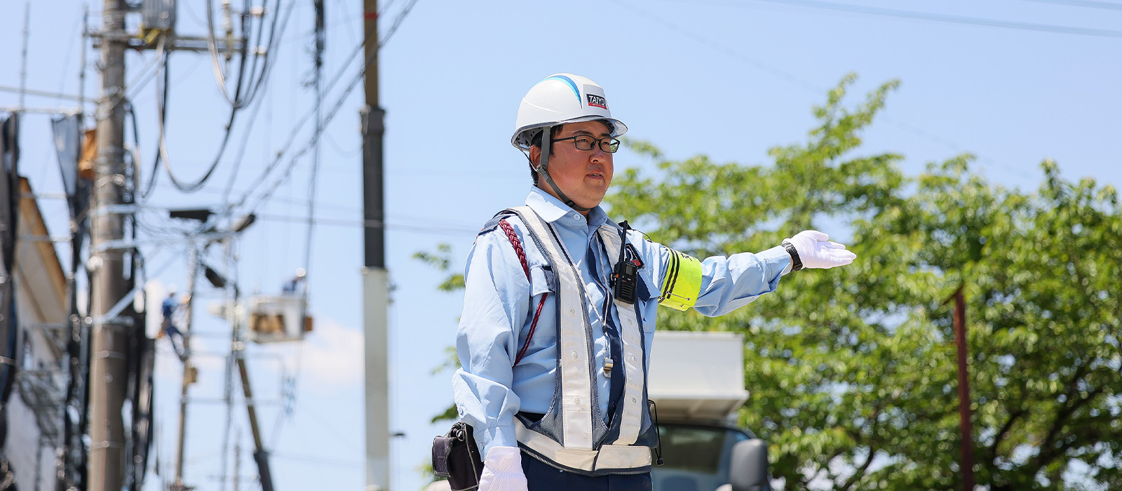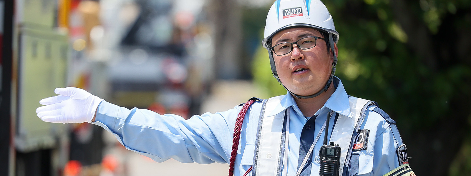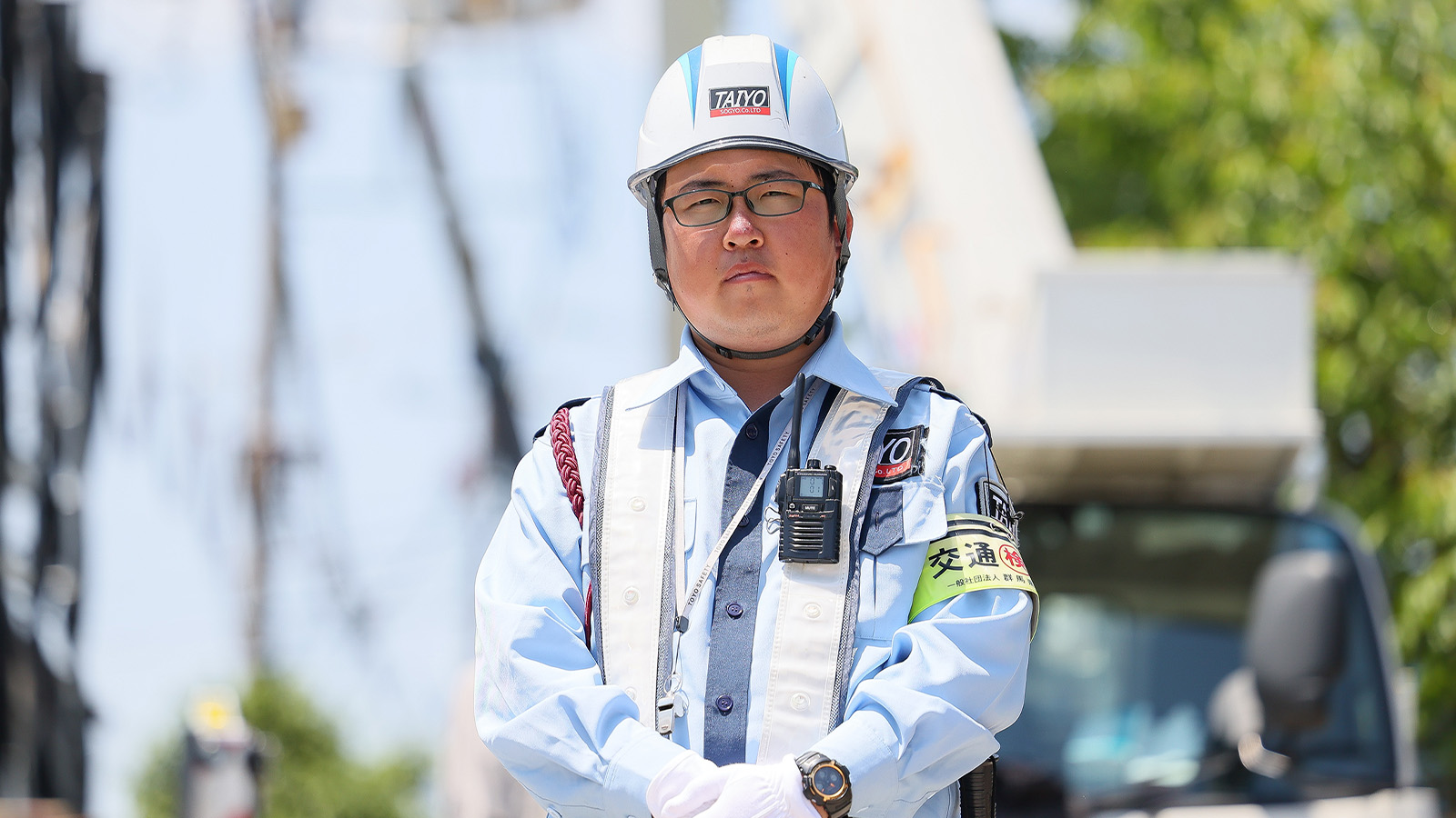 - 交通誘導警備や雑踏・イベント警備を中心に行っています。現在は、電気工事を行う現場で、工事車両や通行車両、歩行者の安全を守ることに注力しています。また、私の場合、交通誘導警備業務検定の2級、雑踏警備業務検定の2級を取得しているので、警備リーダーとして隊員への配置指示や、工事作業を行う班長との打合せなど、現場が円滑に進むための管理業務も行っています。