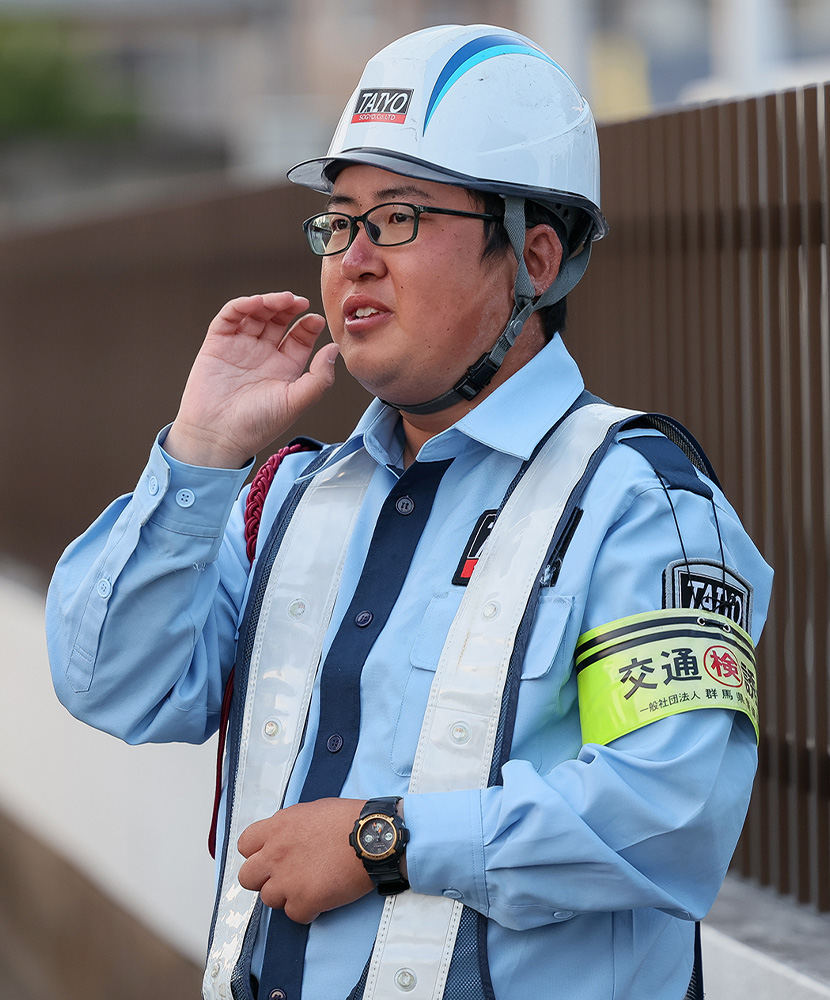 - 通行者や歩行者、地域の方に「ありがとう」と感謝の言葉をいただけたときはやっぱり嬉しいですね。時には飲み物の差し入れをいただけることもあります。また、毎回現場が異なるので、現場をイチから組み立てる大変さはありますが、同時にやりがいにも繋がっています。資格を取得したことで仕事の幅も広がり、これまで以上に責任感を持って警備業務に従事しています。
