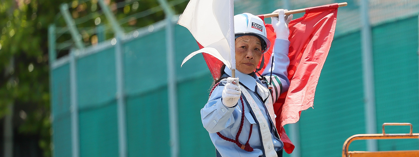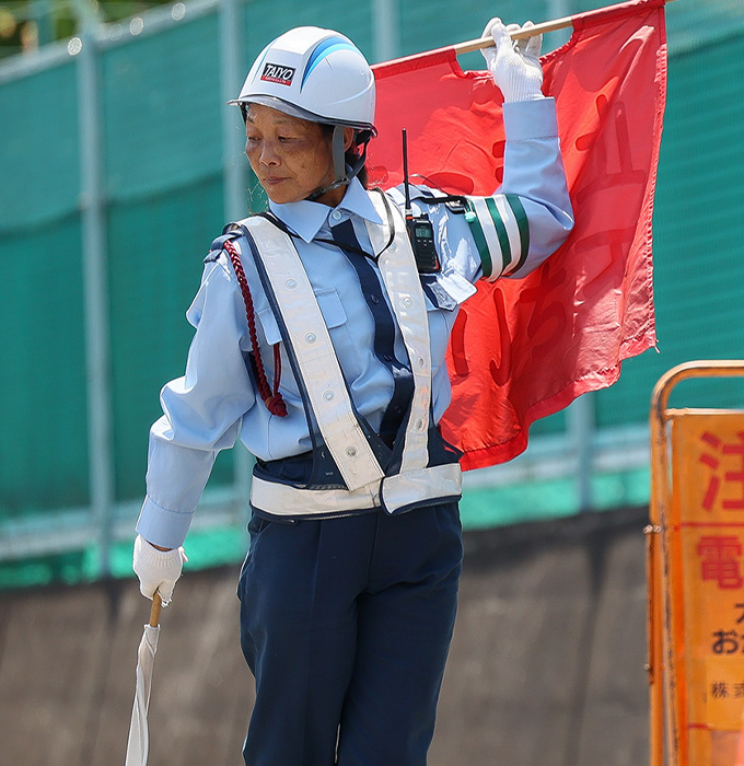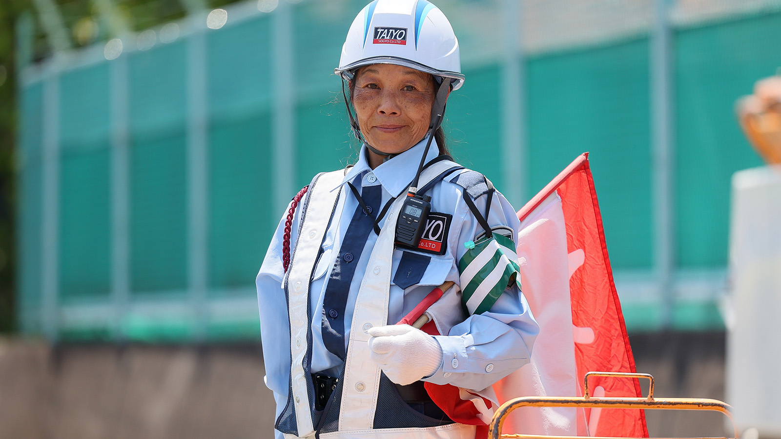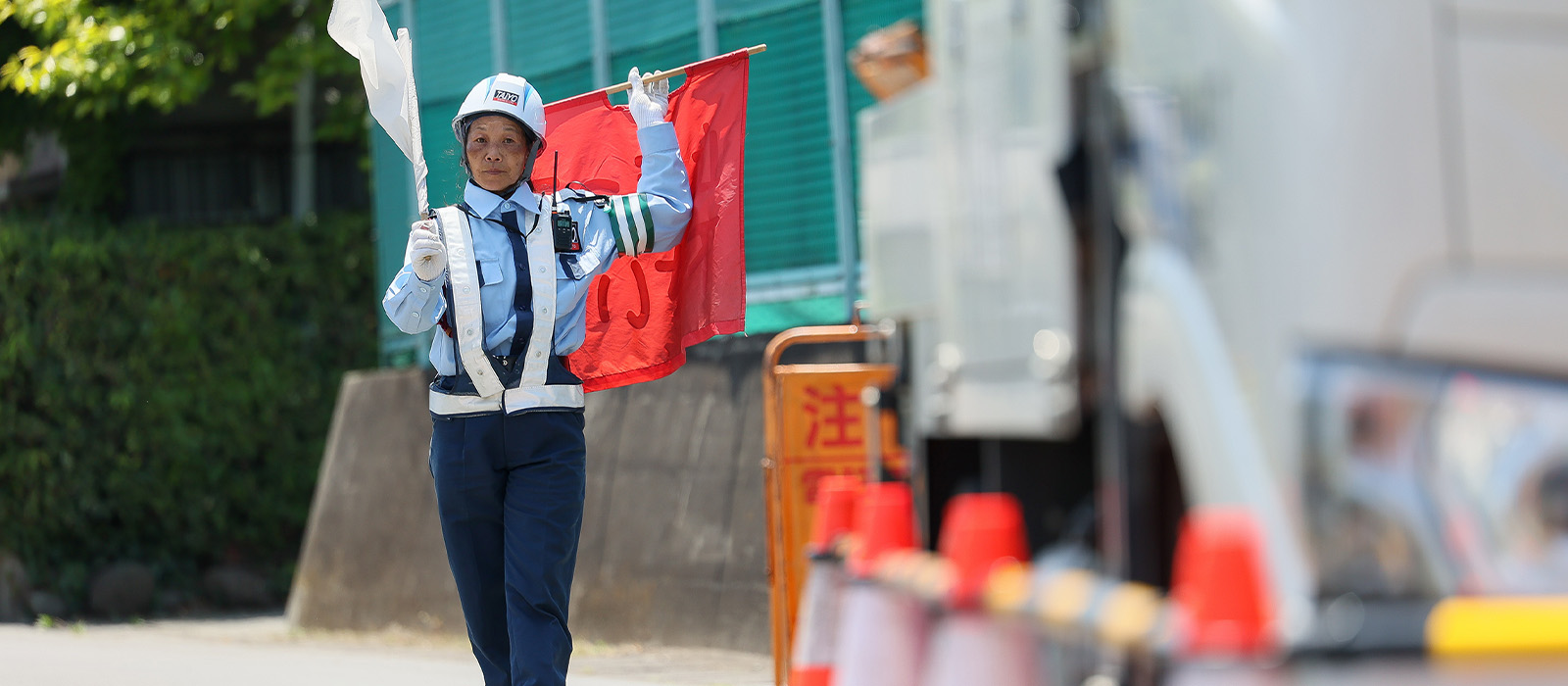 - 私の場合、工事の現場が毎日変わるので、現場の環境、工事車両の動き、一般車両の流れなど、その場の状況判断を早くするよう心掛けています。こちらのちょっとした迷いが、皆さんの不安や迷いに繋がってしまうので、そうならないよう気を付けています。他には、声がけですね。「工事の作業車が出ていますので、気をつけてお通りください」など、その場を通行される皆さんに状況がわかっていただけるよう、声がけをしています。