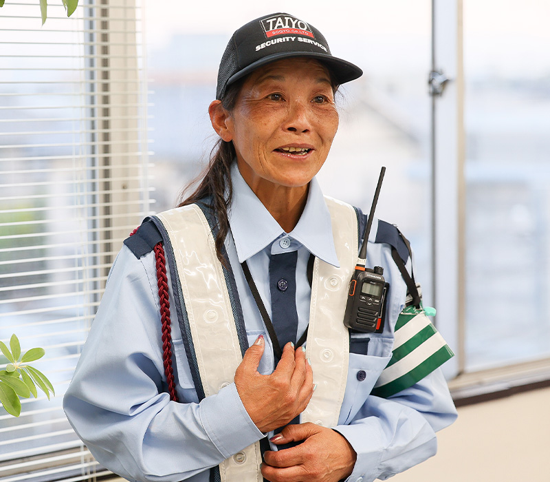 - 20年来、学生服の販売員をしていたのですが、派遣契約が終了になり、新しいお仕事を探し始めたのがきっかけでした。いろいろな業種の求人に応募しましたが、年齢的なこともあり、どれも採用まで行かなくて。実は、別の警備会社にも応募したんですよ。でも、そこは面接することも叶わなくて…。そんなとき太陽総業に連絡したら、快く対応してくださり、入社することになりました。