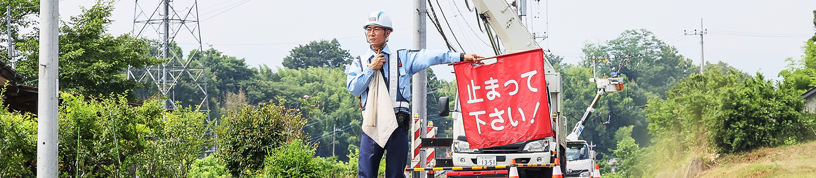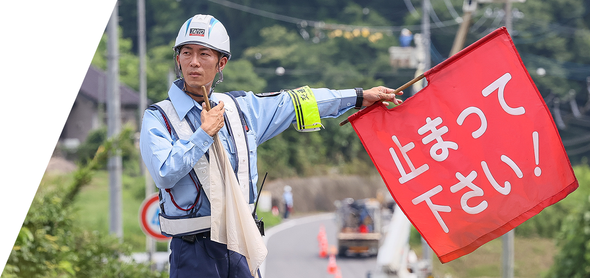 到着後、すぐに車両を降りて、片側交互通行(通称「片交」)が行える位置に移動し、交通誘導警備開始