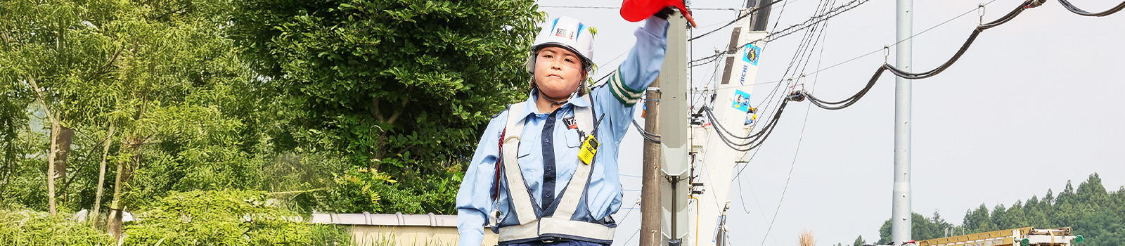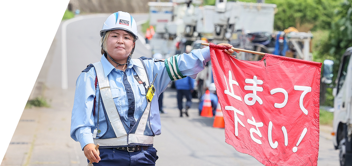 工事車両が規制帯に入り工事が開始され、片側2車線の国道規制にて黄旗で車線変更誘導する